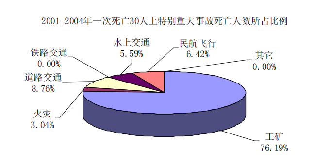 2001年平均22.3 天發(fā)生一起一次死亡30人以上特別重大事故,2002年-2004年平均26.7天發(fā)生一起一次死亡30人以上特別重大事故。其中:煤礦企業(yè)平均47.1天發(fā)生一起一次死亡30人以上特別重大事故。