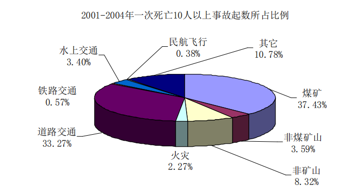 2001年平均 2.5天發(fā)生一起一次死亡10人以上特大事故,2002年-2004年平均2.8天發(fā)生一起一次死亡10人以上事故。其中: